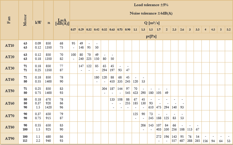 Tabulka specifikací ventilátoru AT